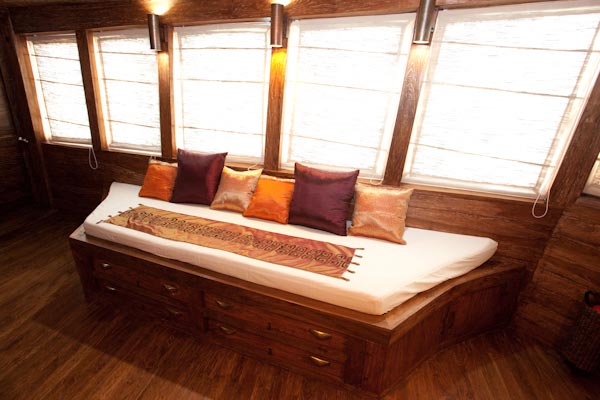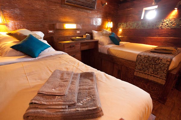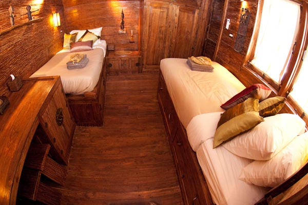 There are 7 cabins on the lower deck (3 doubles, 3 twins and 1 with a double + a single bed) and there are also 2 cabins on the Main Deck both with 1 double + 1 single bed in each cabin and a sea view.