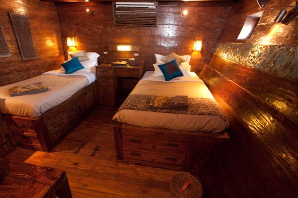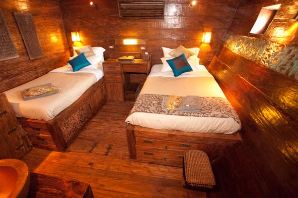 Accommodation in a double-bed or twin-bed cabin with en-suite bathroom, toilet and AC