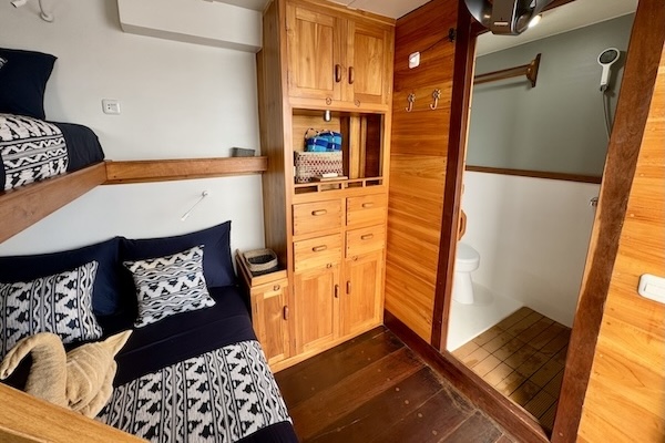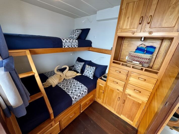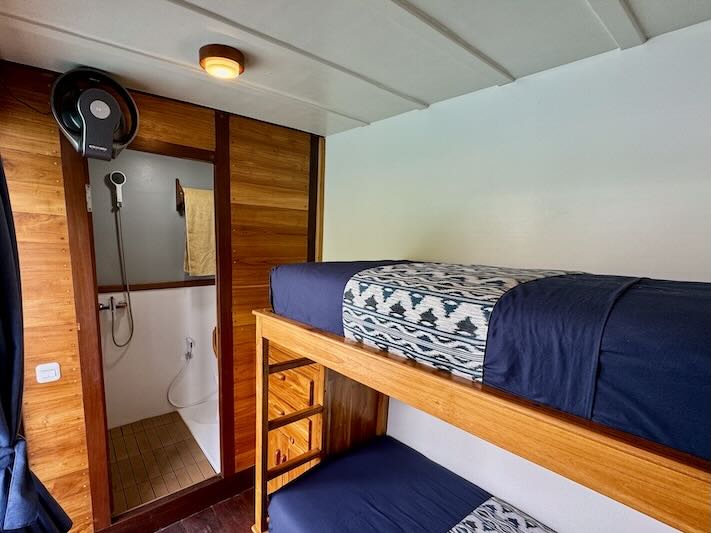 Bajau offers two cabin options: two triple cabins and two twin cabins, all equipped with en-suite bathrooms, providing cozy comfort for the guests.