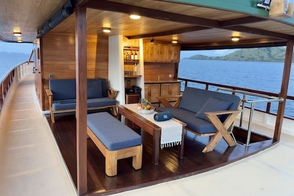 For those seeking a more elevated experience, the upper deck boasts a semi-covered large area, complete with a bar and an open space ideal for yoga, sunbathing, stargazing, or even sleeping under the stars.