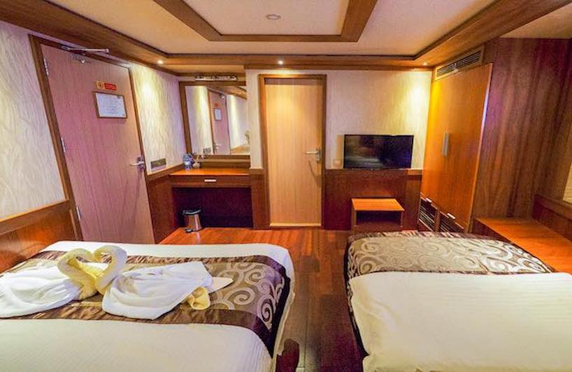 The Deluxe Double or Twin cabins have a double bed and a single bed with an en-suite bathroom and shower and are located on the lower deck