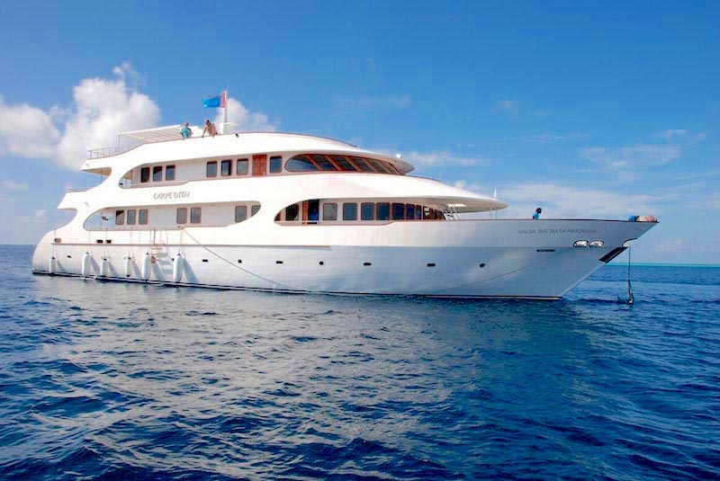 Carpe Diem, the sister ship of the stunning Carpe Vita, is a 35 m long motor safari yacht with a wooden hull, designed and built in the Madives that caters to 20 guests in 10 air conditioned cabins (1 dbl or twin Suite, 1 Deluxe, 2 Double and 6 Standard).