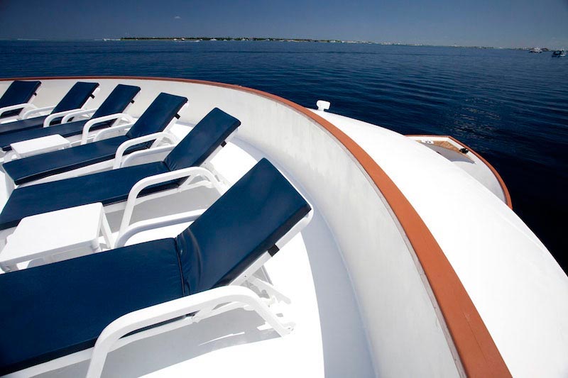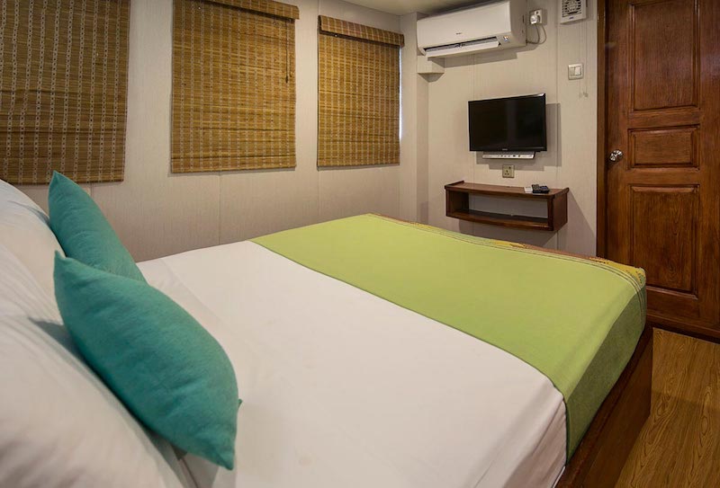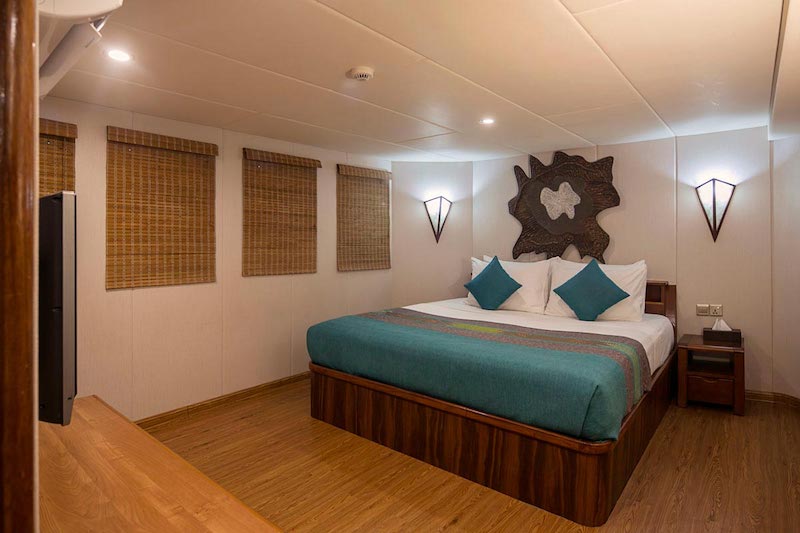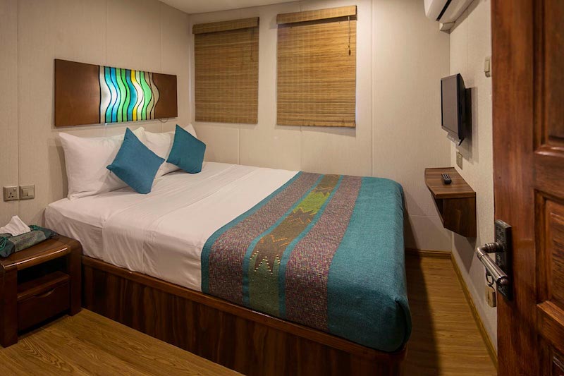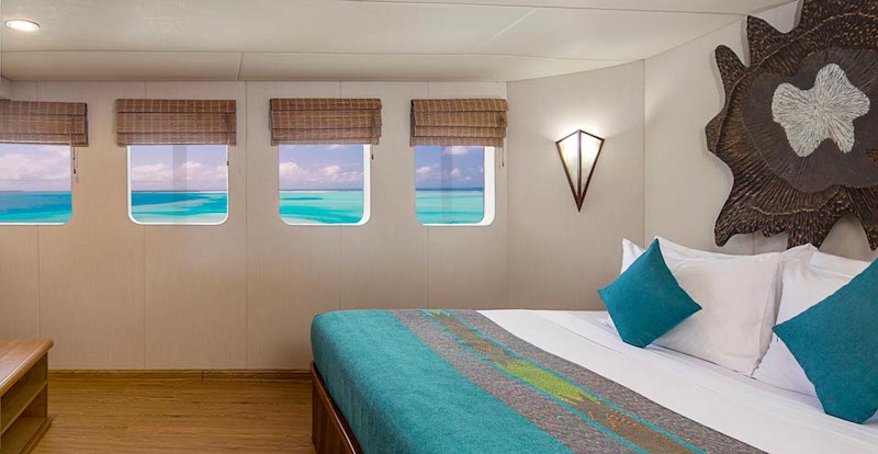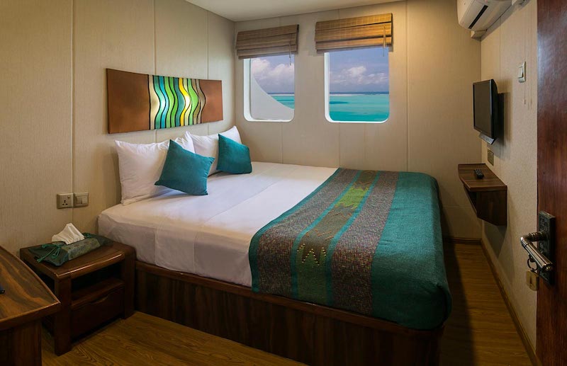 Opposite the suite on the upper deck is the big Deluxe cabin with a queen size double bed, flat screen TV plus DVD/MP3 player and 3 windows overlooking Maldives blue waters.