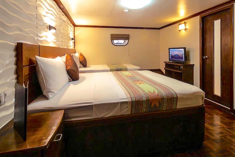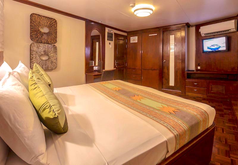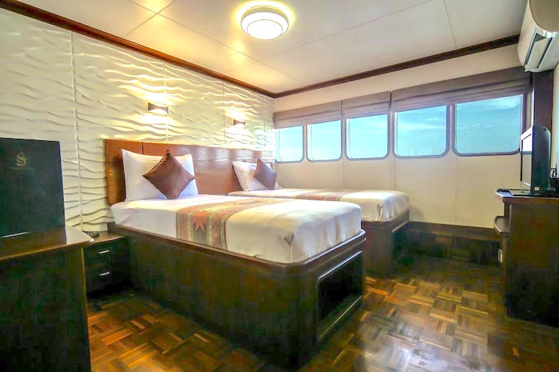 The two superior cabins, located on the main deck, have king size beds which can be separated in two super single beds and desk/chair/dresser, hanging closet, large windows, private ensuite bathroom and shower cubicle.