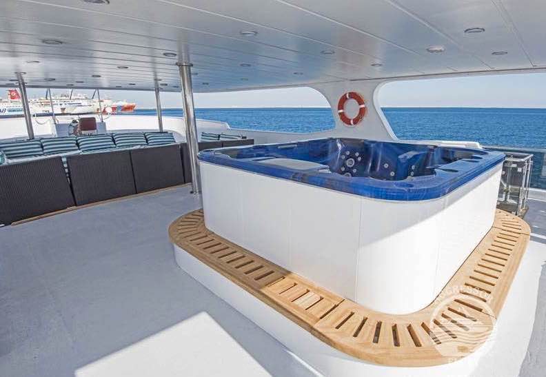 She cruises at 12 knots, has a beautiful spacious salon, sundeck, chaise lounges, deck chairs, bar, grill, and a complete photo/video center and accommodates 22 passengers in 11 staterooms; 8 staterooms with two single beds in each, 2 staterooms with Queen size beds and 1 stateroom with a king size bed.