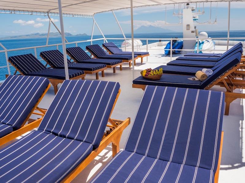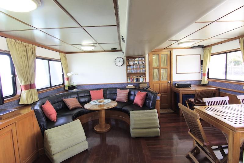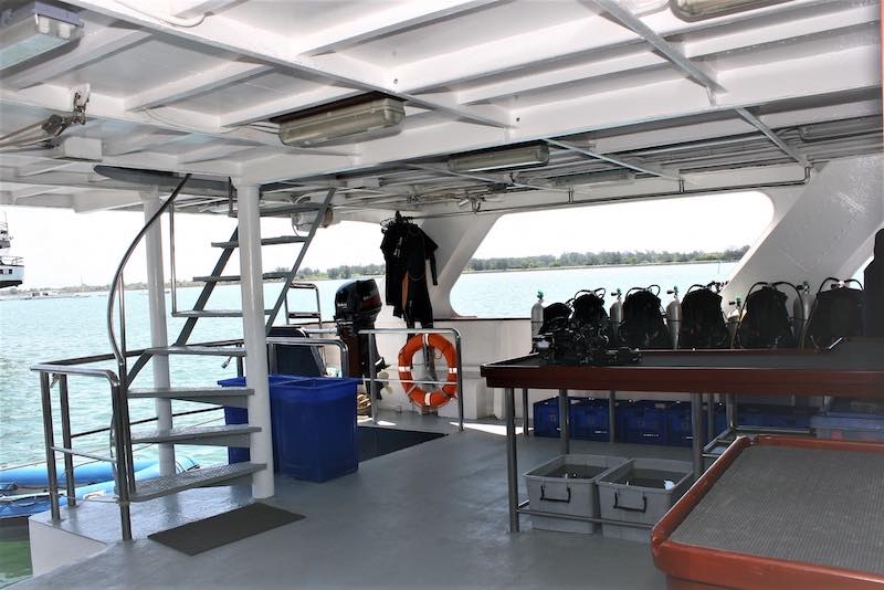 There is a wide stern dive platform with two exit ladders and fresh water showers. 4 camera rinse tanks, a large camera table and our resident on-board video and photo professional will help keep all the photographers happy and help with your all important lens decisions.