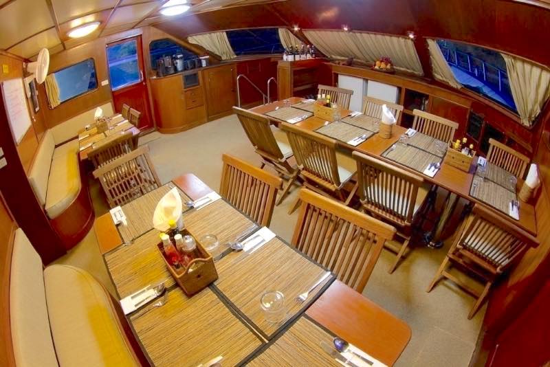 The saloon is large and spacious with lounge suites and big windows, bar fridge, tea and coffee facilities, TV/DVD, music center, library and a full selection of marine life books.