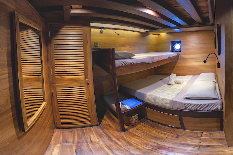 Ondina has 8 cabins and are all double or Twin occupation on the Lower Deck except the two at the front of the ship both with a double bed only, the rest have a double bed and a single bed on top, all with AC and full bathroom.