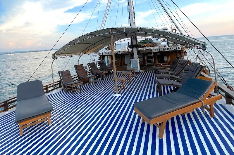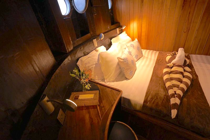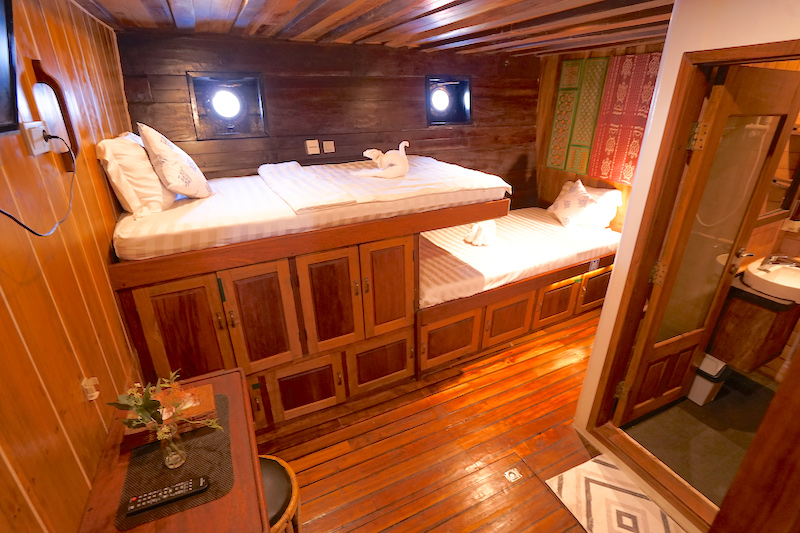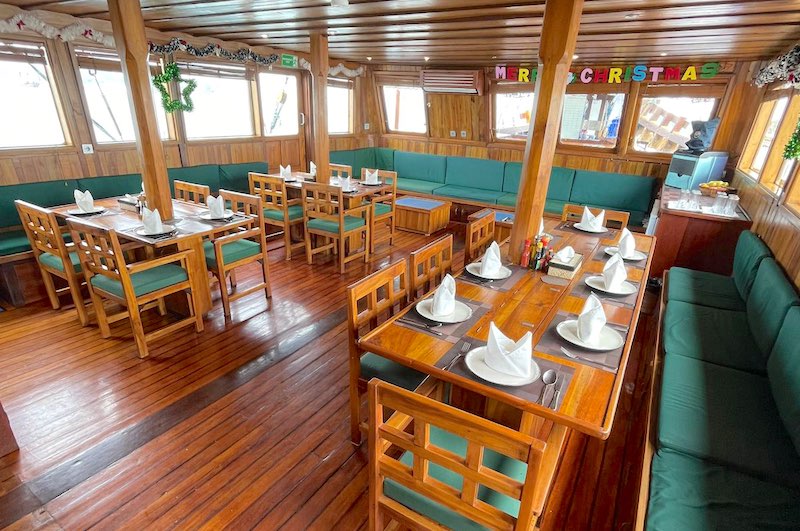 With five freshly prepared meals per day with a perfect blend of Indonesian, European and Japanese specialties with soft drinks and beer all included in the price you can't go wrong. The cabins are all also longitudinally aligned with the vessel, so you sleep in the direction of the vessel's movement.