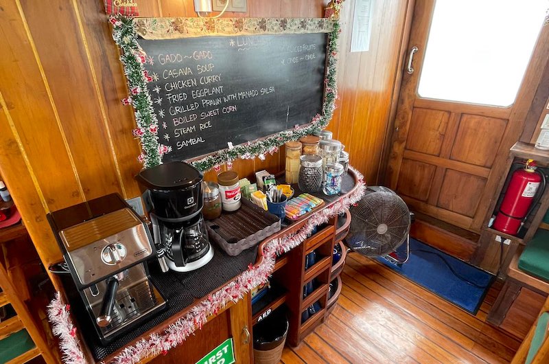 Tambora Yacht serves five freshly prepared meals per day with cuisine being the perfect blend of Indonesian, European, and Japanese specialties and soft drinks, water, tea, coffee, and beer are all included in the cruise price (beer included only for non discounted trips).
