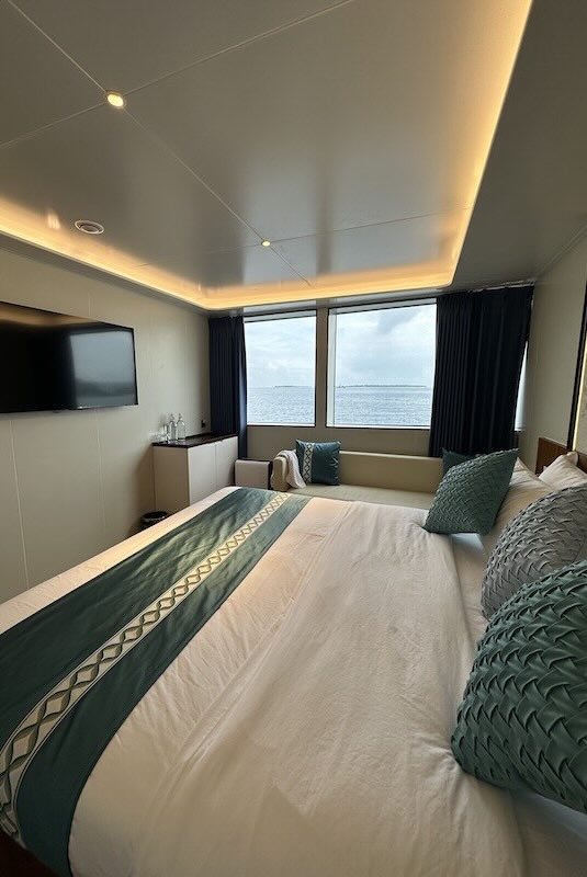 The two double bed junior suites on the main deck offer stunning sea views and are equipped with air conditioning, a television, and a safety deposit box.