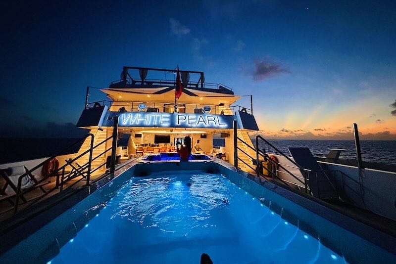 This is a stunning high end diving liveaboard with Free Nitrox and WiFi, a 6 meter jacuzzi and water slide, all cabins have a seaview, free use of SUP boards and Kayaks with GST and fuel surcharge included in the trip price and an on-board spa and jet ski at an extra charge whilst still being a top end dive boat.