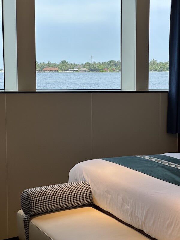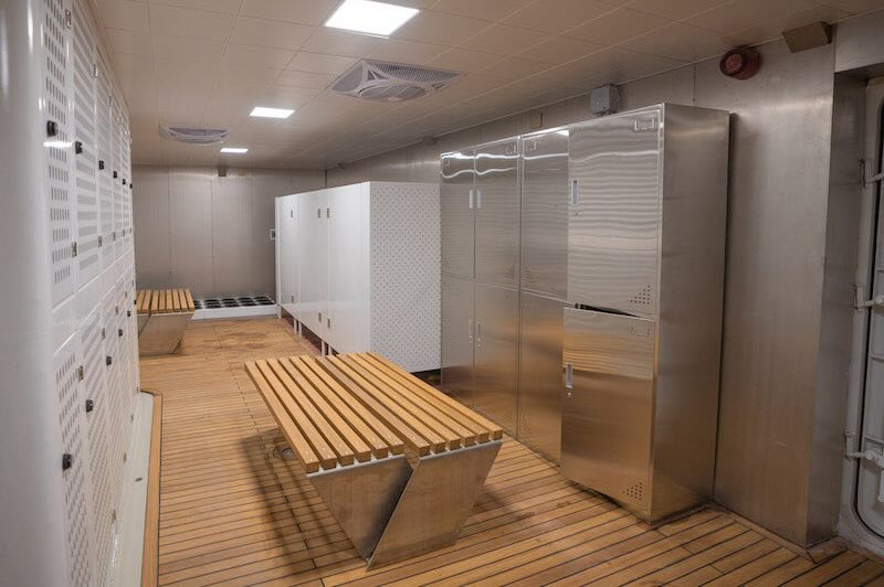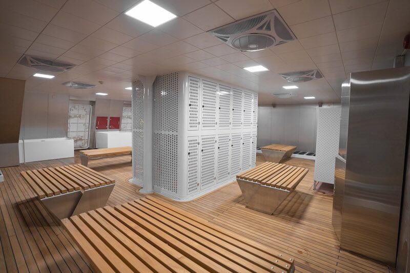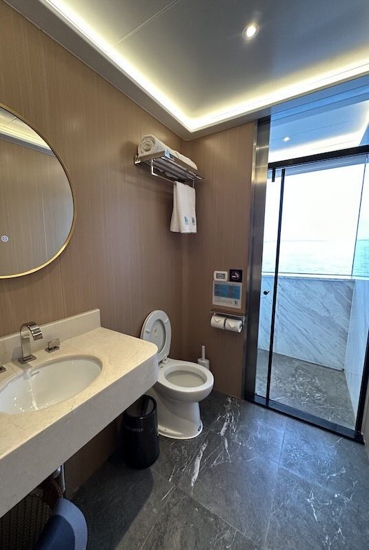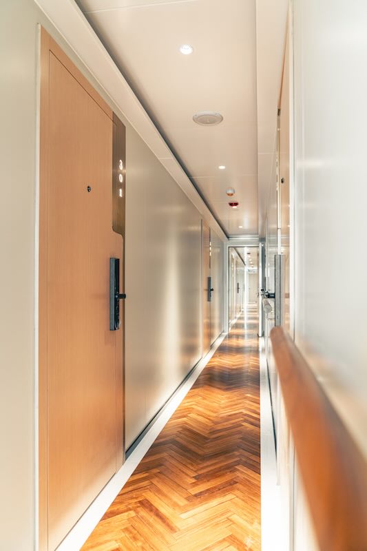 Each cabin is equipped with air conditioning, a television, and a safety deposit box.