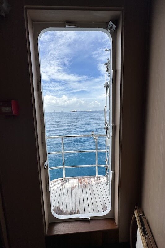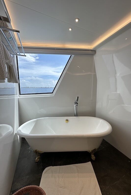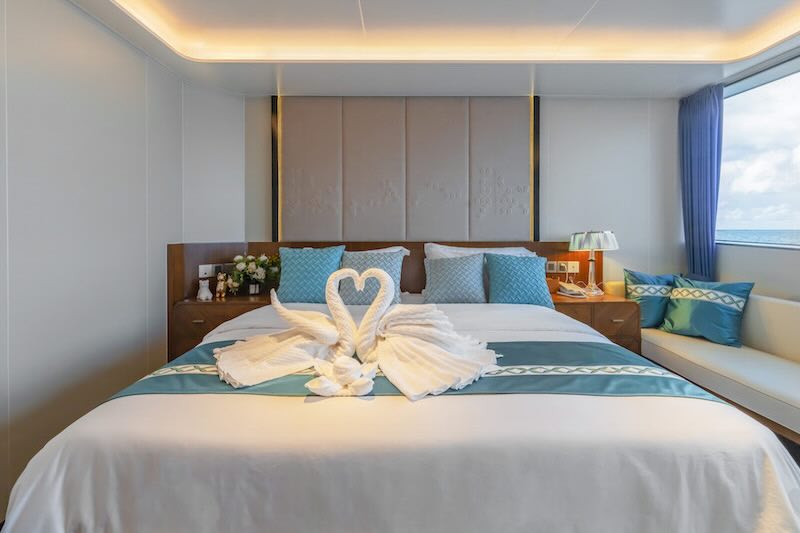 The two double bed junior suites on the main deck offer stunning sea views and are equipped with air conditioning, a television, and a safety deposit box.