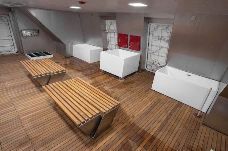 The Liveaboard offers a variety of incredible amenities, including a sun deck, huge Jacuzzi, dining area, camera room, diving area and a range of cabins with basic amenities and an entertainment area with Tv's, gaming consoles and gym equipment.