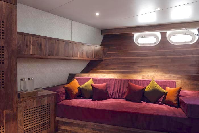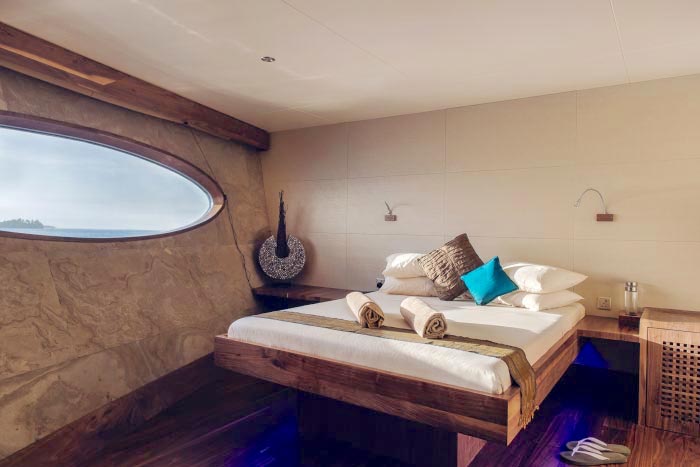Earthy and blue fabrics complement the natural colour scheme whilst oval panoramic windows set into the hull offer uninterrupted ocean views and total privacy.