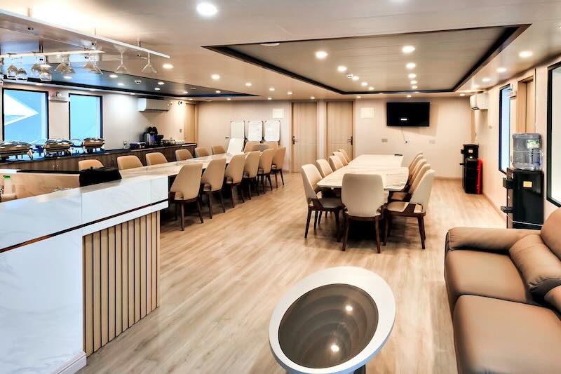 A dedicated camera area allows divers and snorkelers to manage their gear, while the air-conditioned lounge, stocked with books and movies, offers a quiet retreat.