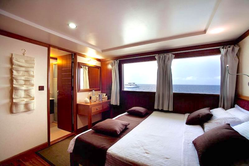 The Duke of York Liveaboard is a luxurious 36m long vessel that offers a unique and unforgettable diving experience in the Maldives and accomodates 21 guests in 11 cabins in 3 Upper deck cabin with one queen size bed and one single bed, 1 main deck twin cabin, 4 Lower deck double / twin / triple with one double bed and one single bed and 2 Twin beds cabins and a single on the Lower deck.