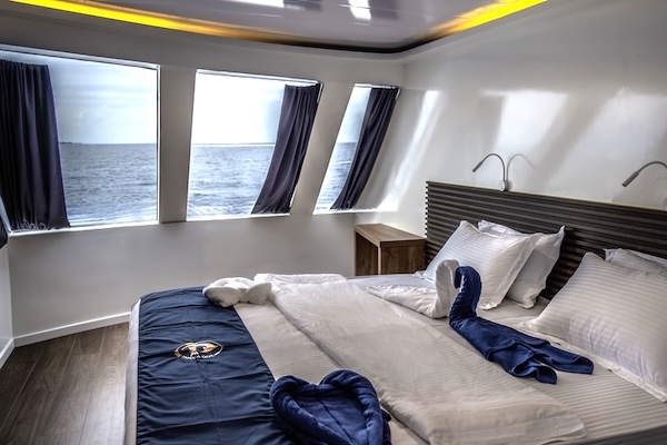 Up on the upper deck there are 2 "Deluxe" cabins at the front of the ship with panoramic ocean views and 4 "Superior" Cabins also with a sea view windows featuring convertible twin or double beds suitable for friends or a couple.
