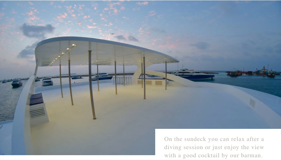 On the top deck is a large spacious sun deck area for enjoying the Maldivian sunshine between dives.