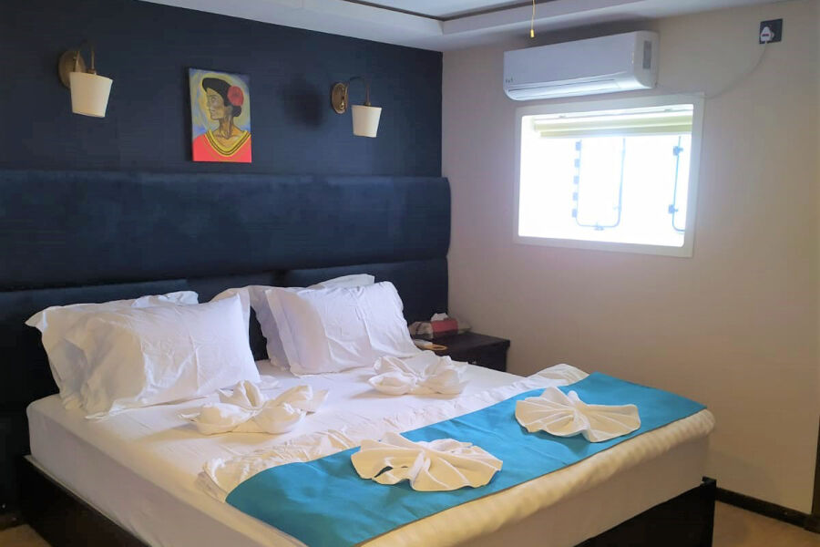 Blue has 11 cabins for 22 guests on 3 different decks consisting of 7 lower deck deluxe cabins, 2 main deck Master cabins and 2 Ocean view cabins on the Upper deck.
