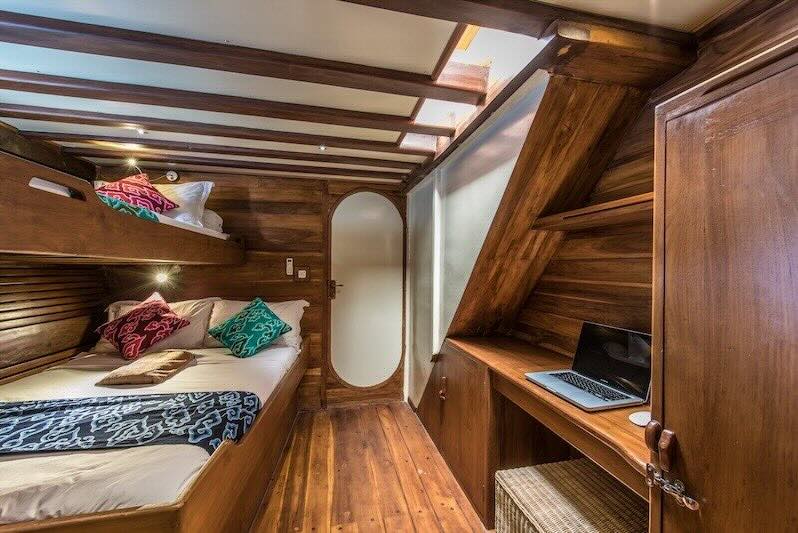 The two cabins Pandan and Kayu Manis are on the lower deck and are mirror images of each other and are capable of sleeping up to 3 guests in a double/single bunk bed configuration.
