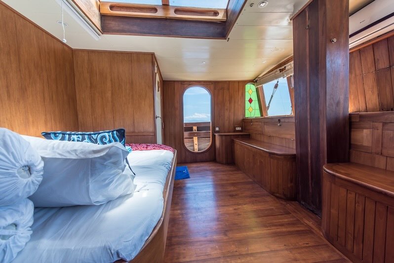 Carpe Diem Phinisi caters to a maximum of 8 guests in 4 cabins made up of 1 large double cabin on the main deck (Pala) and one twin or double cabin on the lower deck (Cengkeh) and 2 identical lower deck cabins that have a double and single bed and that can be a double / twin or triple cabin (Pandan and Kayu Manis)