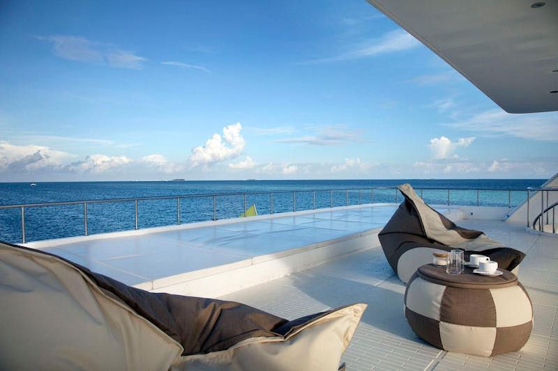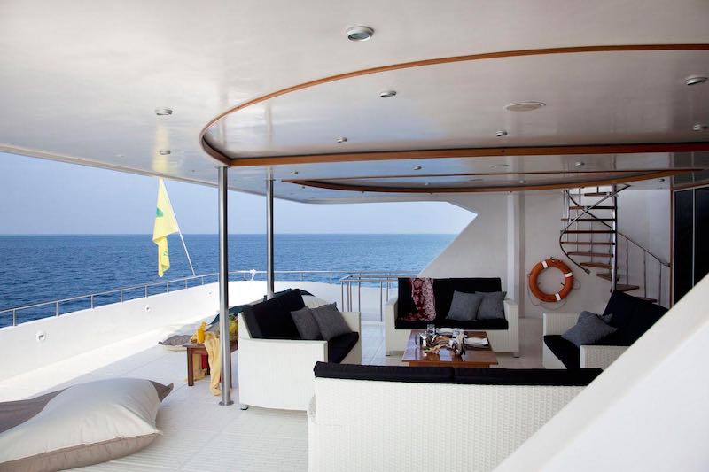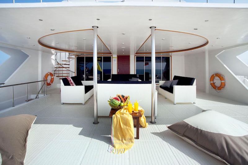 The yacht also features a sun deck, Jacuzzi, and onboard restaurant serving delicious meals on 4 different decks.