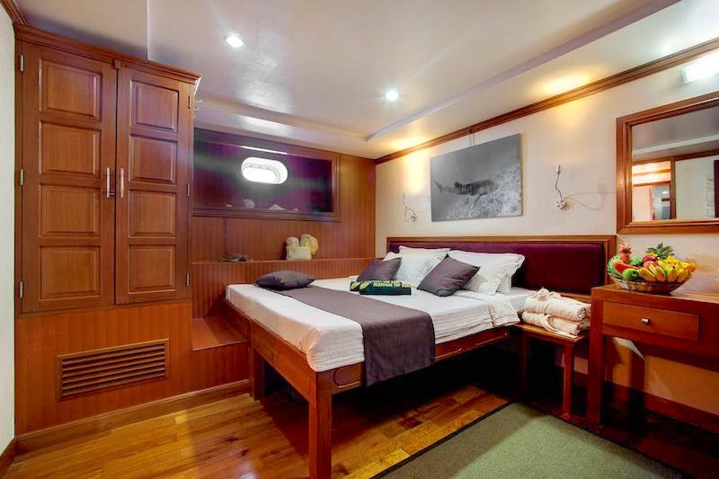 The Duke of York Liveaboard is a luxurious 36m long vessel that offers a unique and unforgettable diving experience in the Maldives and accomodates 21 guests in 11 cabins in 3 Upper deck cabin with one queen size bed and one single bed, 1 main deck twin cabin, 4 Lower deck double / twin / triple with one double bed and one single bed and 2 Twin beds cabins and a single on the Lower deck.