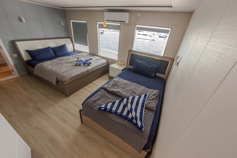 The Upper Deck cabins have sea view windows, 2 are suites with a king-size double and single bed, 1 cabin with a double and a single bed and 1 cabin with a double bed only.