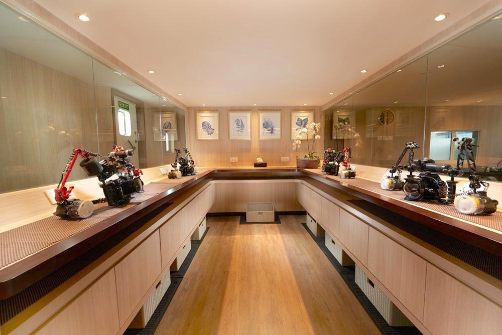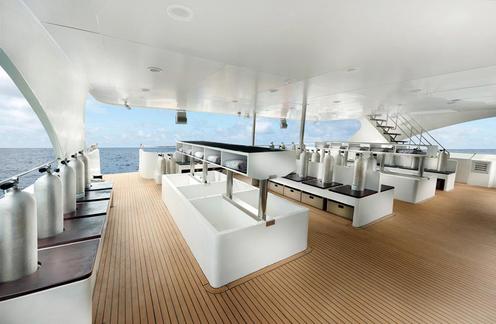 At the rear is a large dive deck so there is lots of space for guest to move around. On the dive deck are also eleven large rinse tanks of various sizes, for camera setups of all sorts.