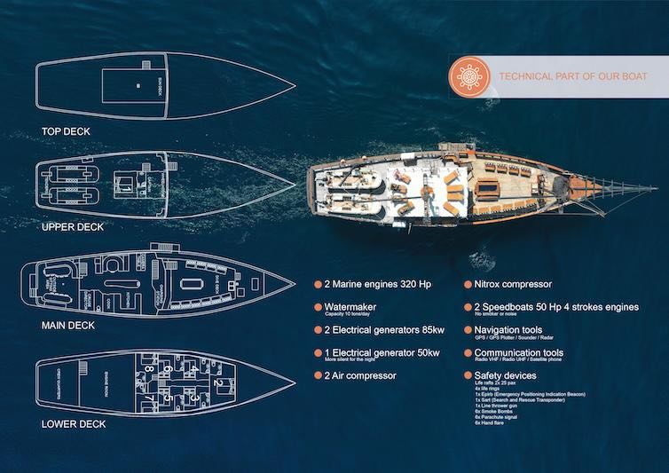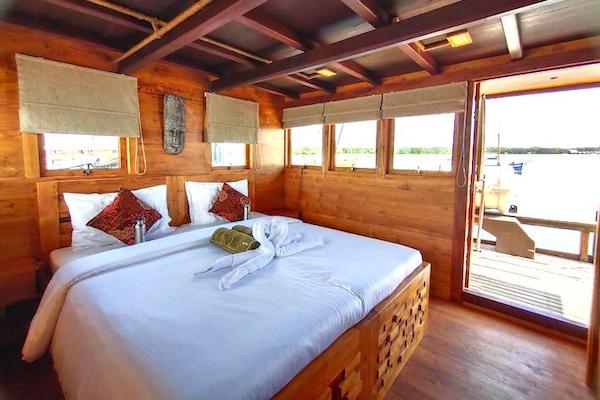 Each cabin has a double bed below + a single bunk bed on top and are fully air-conditioned with ensuite bathroom with hot water shower, toilet and sink.