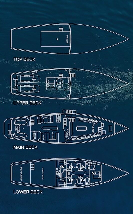 Ilike hosts a total of 16 guests in 8 cabins that are fully air-conditioned with ensuite bathroom with hot water shower, toilet and sink.