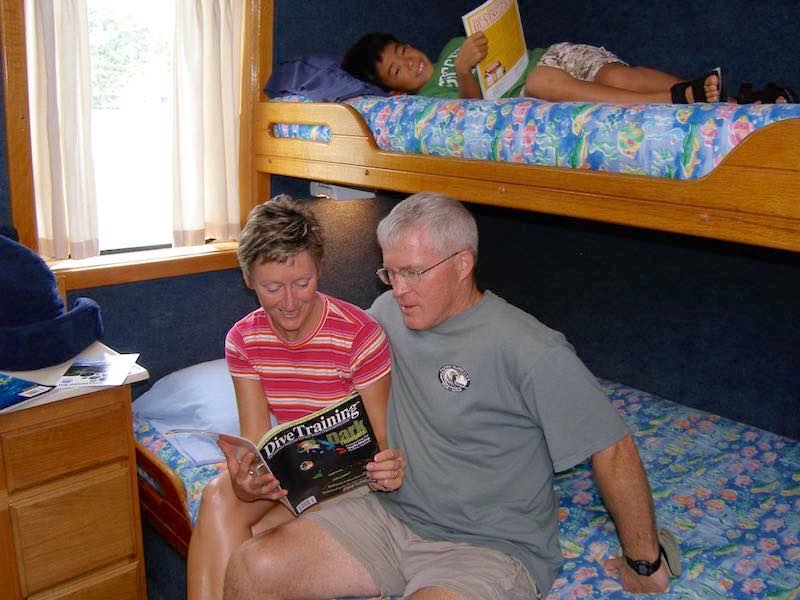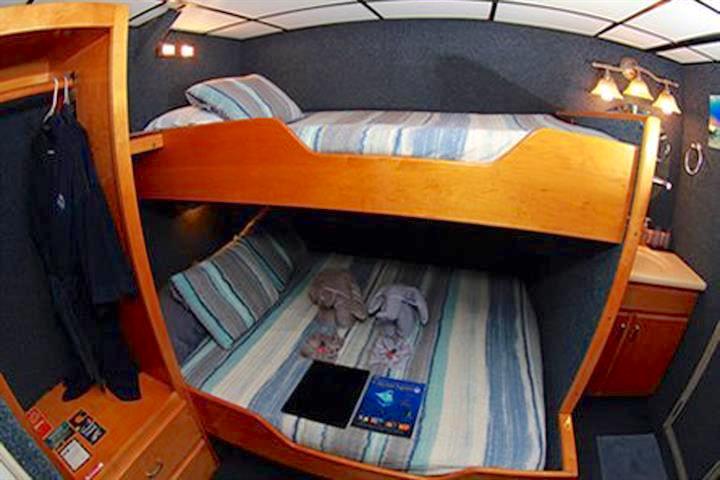 is located on the dive deck has a double bed and a single bed in bunk style layout and porthole window looking onto the dive deck.