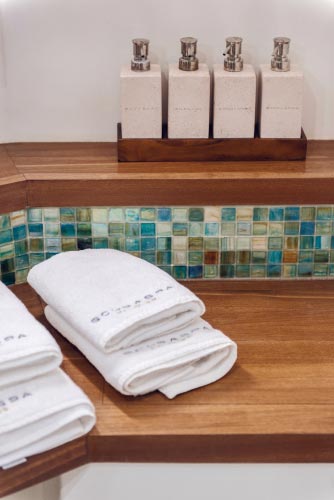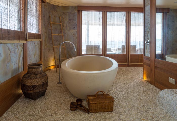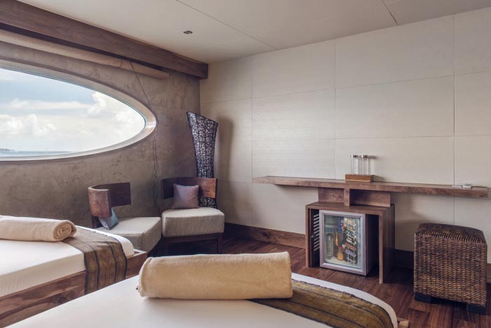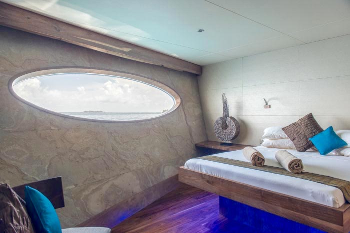 Earthy and blue fabrics complement the natural colour scheme whilst oval panoramic windows set into the hull offer uninterrupted ocean views and total privacy.