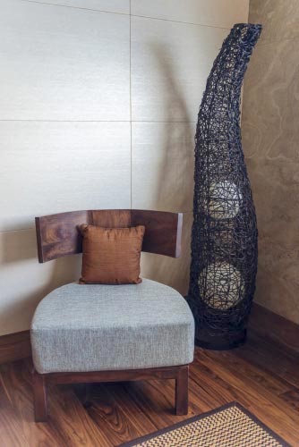 Sensuous driftwood sculptures blend with earthy and jewel tones to provide a relaxing setting.