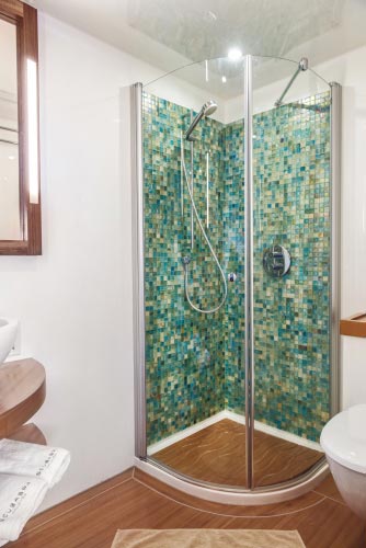 There is a queen-size bed and a lavish ruby-coloured sofa, that can be transformed into a comfortable third bed. As the Cowrie Suite spans the width of the bow it has four opening portholes, and the spacious en suite bathroom houses the largest shower on board.