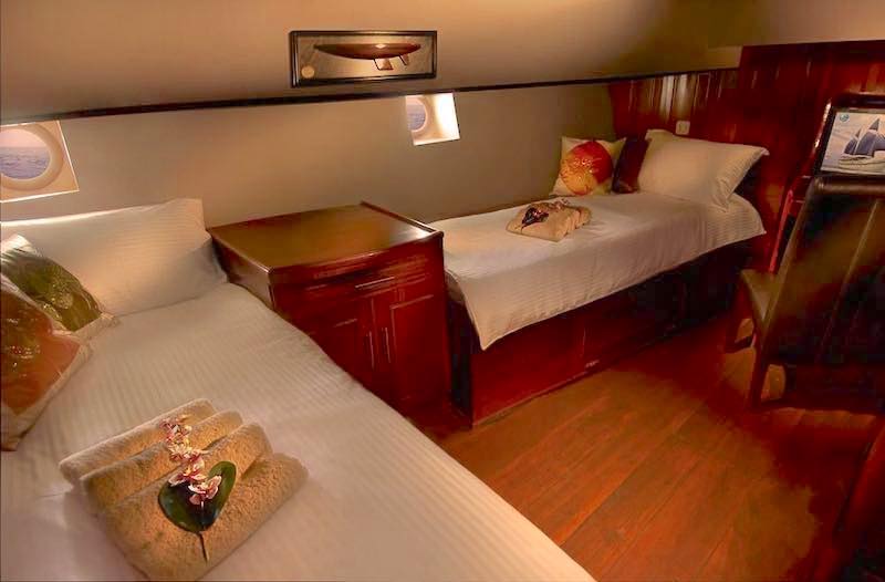 The lower deck double/twin cabin has 1 single beds and 1 double bed suitable for 2 single divers or a couple.
