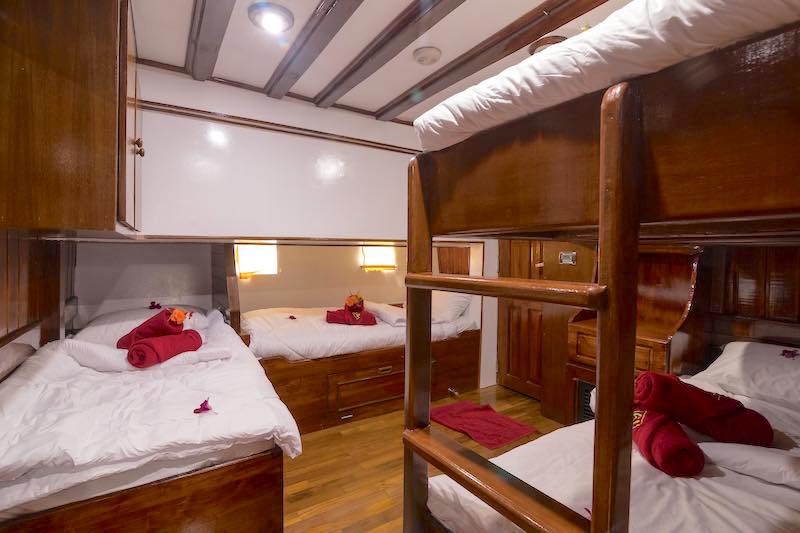 The 2 lower deck quad cabins have 4 single beds for 4 single divers.